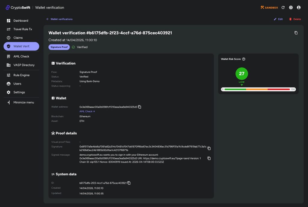 This flexibility matters because wallet verification is not one-size-fits-all. A crypto-native product, a regulated financial institution, and a Travel Rule provider may all need wallet verification, but they do not necessarily need the same flow.