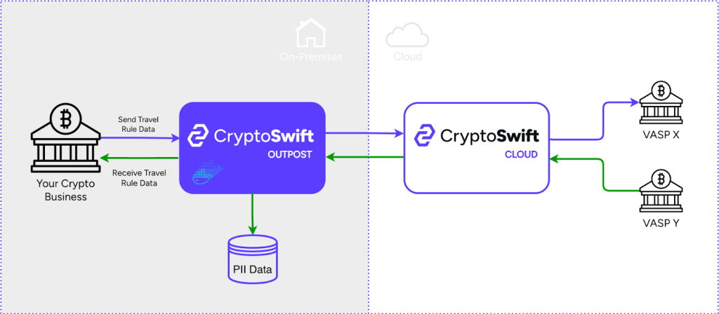 It keeps Travel Rule PII anchored on-prem in the client’s own environment, while preserving integration with CryptoSwift for core transaction processing. It provides a secure, auditable, single-tenant deployment model. And because its architecture is intentionally narrow and lightweight, it is materially easier to maintain than many traditional on-prem solutions.