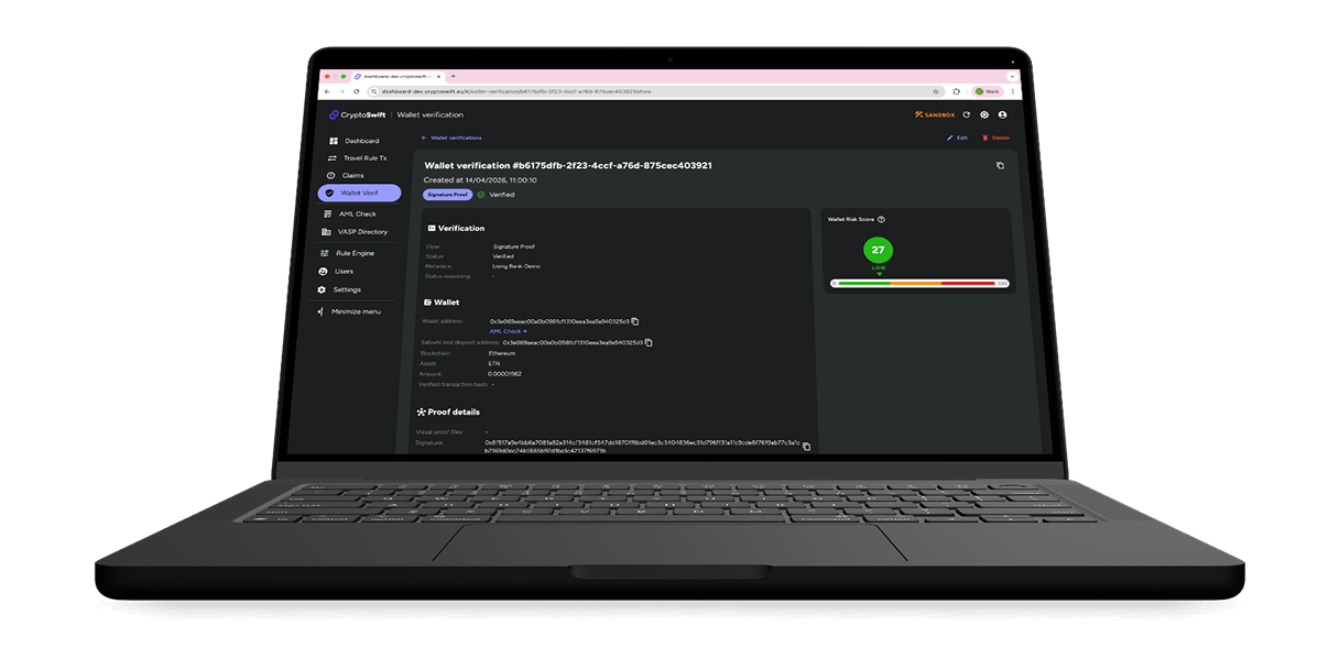 Collect and retain wallet ownership evidence using flexible verification methods integrated into onboarding, withdrawals, or deposit workflows.